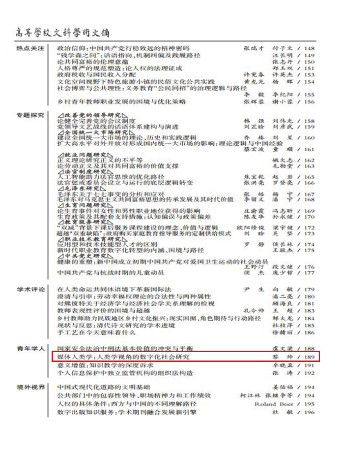 近日,我校人文学院教师黎帅的论文《媒体人类学:人类学视角的数字化社会研究》被《高等学校文科学术文摘》2022年第6期转载。该论文有13000余字,原载《best365体育官网平台_线上365bet开户_365BET娱乐场下载学院学报》2022年第4期。